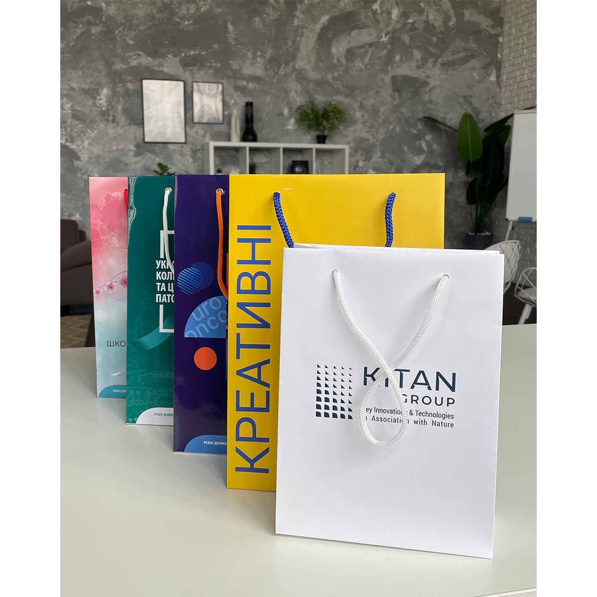 Паперовий пакет з крейдованого паперу, щільністю 170 г/м2, повнокольоровий друк + ламінація. Плетені ручки